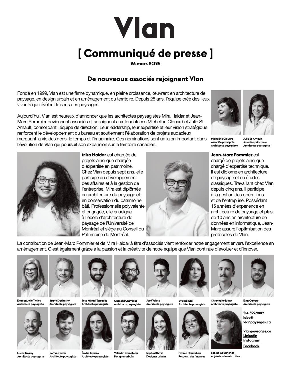 Vlan est heureux d’annoncer que les architectes paysagistes Mira Haidar et Jean-Marc Pommier deviennent associés et se joignent aux fondatrices Micheline Clouard et Julie St-Arnault, consolidant l’équipe de direction.