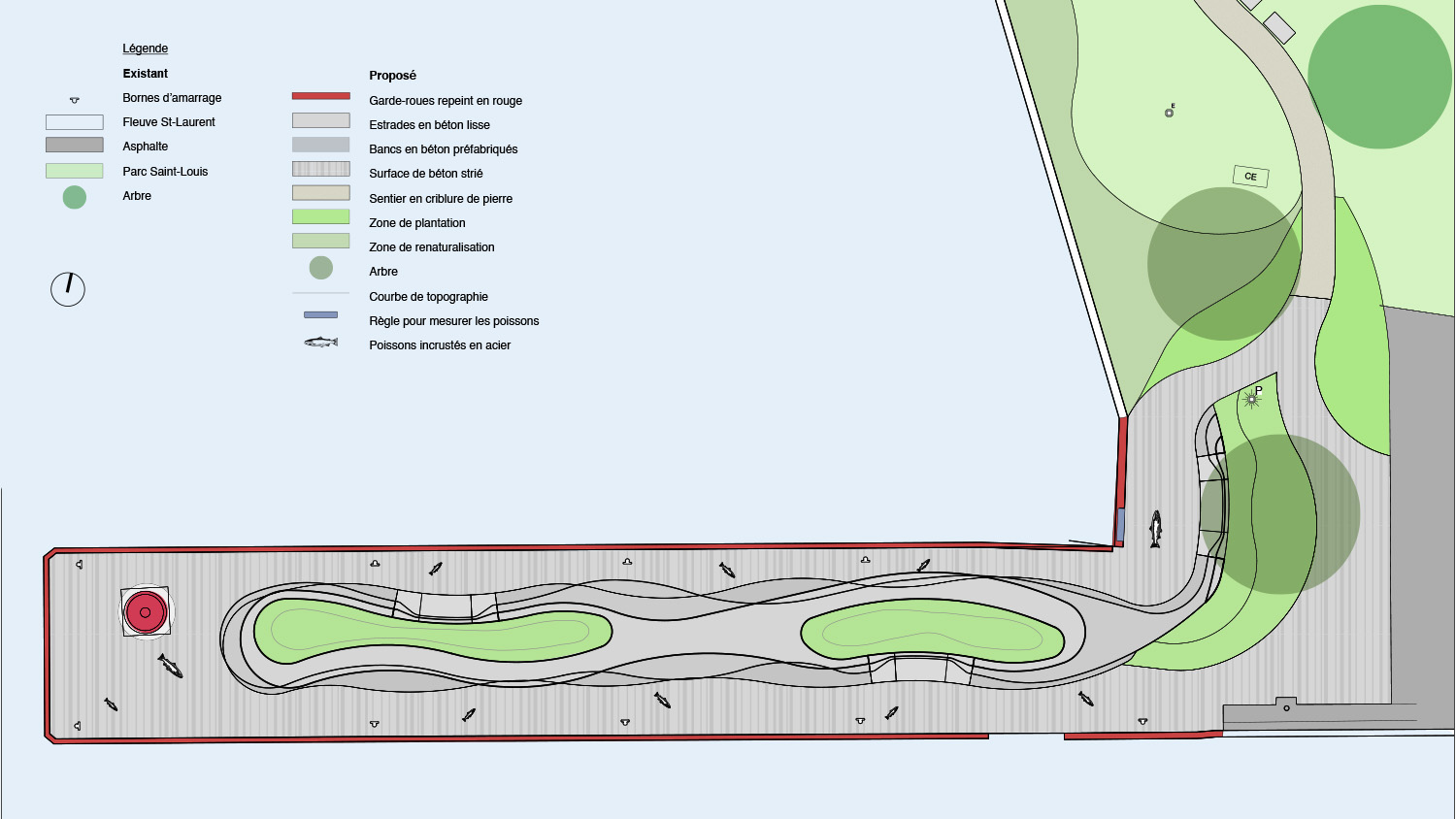 Ancré sur les rives mouvantes du fleuve, le projet soulève des enjeux multiples : gestion des eaux, cohabitation des usages — piétons, cyclistes, navigateurs —, accessibilité universelle, tout en veillant à préserver les équilibres écologiques de cet écosystème fragile. Pensé pour durer, respectueux du vivant et de l’esprit des lieux, l’aménagement se veut inclusif, fonctionnel en toutes saisons et profondément fidèle à l’identité de Lachine.